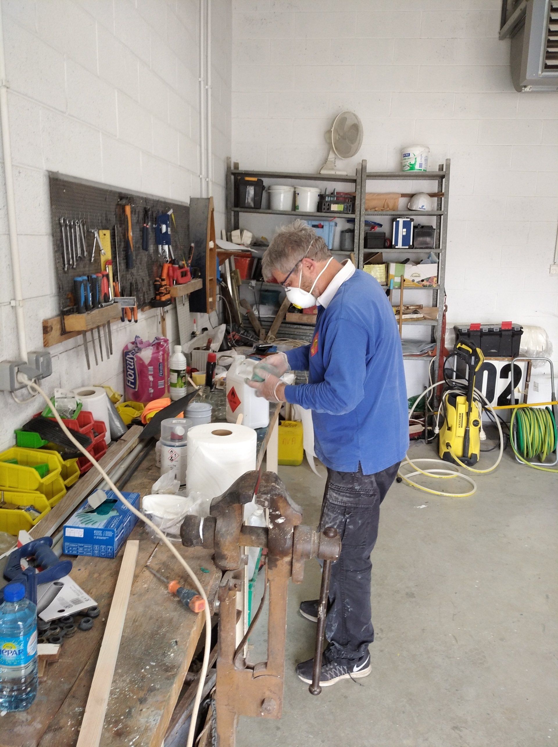 Après un petit café, Christian nous a présenté les différents types de fibre de verre ainsi que leurs caractéristiques mécaniques. Puis il nous a expliqué les techniques de réparation: depuis la préparation du support jusqu’au lustrage final en passant par